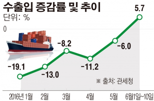 6월 들어 10일까지 수출액은 138억8200만 달러로 지난해 같은 기간보다 5.7% 늘었습니다. 월별 10일까지 수출액은 지난 5월에 이어 두 달째 전년 동월 대비 증가세를 보이고 있습니다.