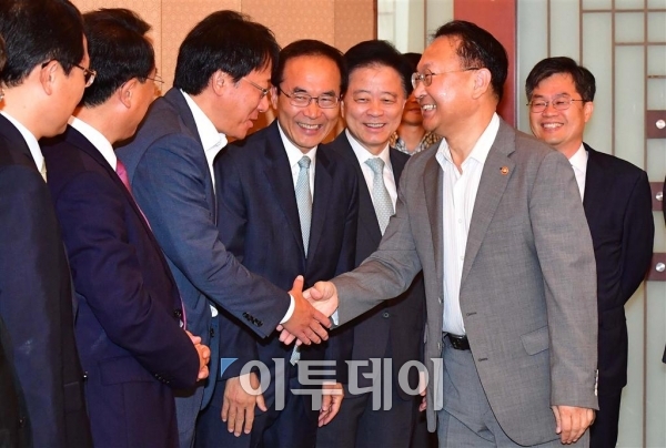 유일호 경제부총리 겸 기획재정부 장관이 17일 서울 태평로 프레스센터에서 열린 주요 연구기관장과의 조찬간담회에 참석해 기관장들과 악수를 나누고 있다. 신태현 기자 holjjak@