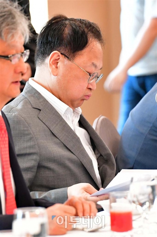 유일호 경제부총리 겸 기획재정부 장관이 17일 서울 태평로 프레스센터에서 열린 주요 연구기관장과의 조찬간담회에 참석해 한숨을 쉬고 있다. 신태현 기자 holjjak@