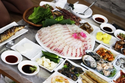 전복, 자연산멍게, 해삼, 산낙지, 털꼬막, 게불, 소리, 치자고구마맛살튀김 등 20여 가지의 정갈한 반찬을 비롯해 쫄깃한 식감이 살아있는 싱싱한 활어회가 제공되며, 조개류를 즉석에서 찌어 먹을 수 있는 것이 특징.