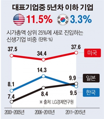 대표 기업 중 설립 5년차 이하인 기업 비중은 미국이 11.5%에 이르는 반면, 한국은 3.3%에 불과했다. 미국 기업들은 신생기업일수록 성장성이 높고, 장수기업은 수익성이 높은 경향을 보였지만, 한국 기업들은 신생기업과 장수기업을 막론하고 성장성과 수익성이 모두 낮은 것으로 파악됐다.