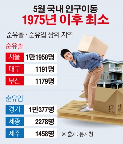 23일 통계청이 발표한 ‘5월 국내 인구 이동’ 자료에 따르면 5월 이동자 수는 58만9000명으로 작년 5월보다 2.7%(1만7000명) 감소했다. 5월 이동자 수는 같은 달 기준으로 1975년(48만명) 이후 가장 적었다.