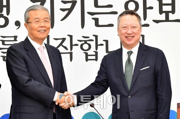 김종인 더불어민주당 대표와 박용만 대한상의 회장이 28일 서울 여의도동 국회에서 만나 악수를 나누고 있다. 신태현 기자 holjjak@