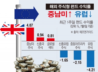 브렉시트 가결 후 해외 주식형 펀드 가운데 중남미 펀드 수익률이 가장 좋았던 것으로 나타났습니다. 반면, 유럽 펀드의 수익률은 저조했습니다.