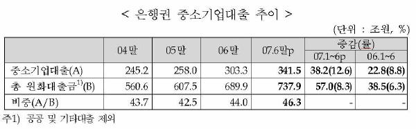 한편 6월말 현재 은행권의 중소기업대출 규모는 342조원 수준으로 지난해 말에 비해 38조2000억원(12.6%) 증가했다.