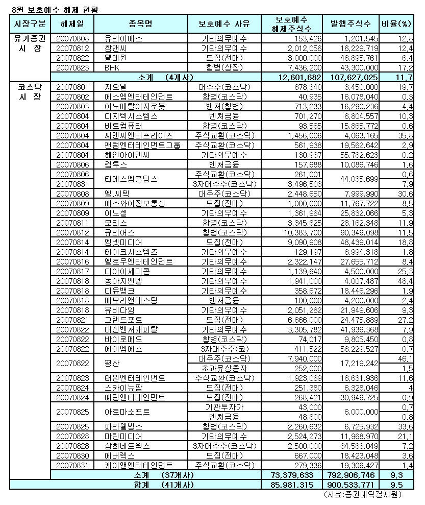 BHK 발행주식의 17.2% 등 다음달에 41개 상장사의 8600만주가 보호예수 대상에서 해제된다.