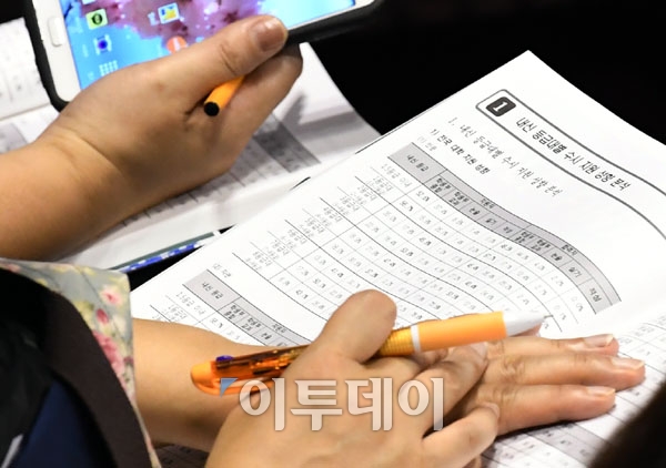 종로학원 대학입시 긴급 설명회가 17일 오후 서울 성동구 한양대 체육관에서 열렸다. 이날 설명회장을 찾은 학부모들이 자료를 살펴보고 있다. 최유진 기자 strongman55@