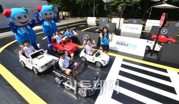 메르세데스-벤츠 사회공헌위원회가 19일 서울 신천동 어린이교통공원에서 공원 리뉴얼 오픈행사를 갖고 이를 알리고 있다. 벤츠는 도로교통공단 및 사회복지법인 아이들과미래와 협약을 체결한 지난해 2월부터 올해 6월까지 4억5000만원의 환경개선 예산을 지원해 어린이들이 보다 건강하고 쾌적한 환경에서 교통안전교육을 받을 수 있도록 어린이 교통공원을 새롭게 단장했다. 신태현 기자 holjjak@