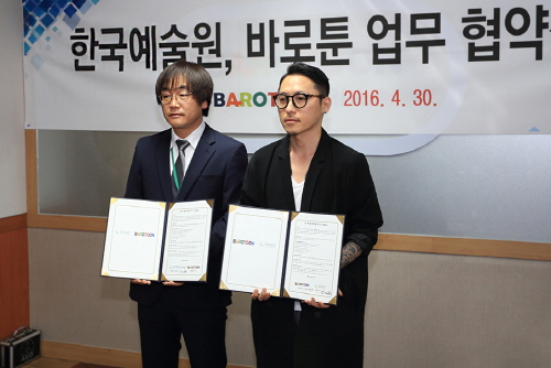 지난 4월 30일, 웹툰 플랫폼 ‘바로툰(BAROTOON)’의 오픈 기념식과 함께 진행된 업무협약 체결식에는 바로코믹스 장병엽 대표를 비롯해 KAC한국예술원 교수로 활동 중인 네이버 웹툰 ‘후유증’의 김선권 작가가 직접 참석한 가운데 업무 협약 체결 및 기념촬영 등의 행사가 진행됐다.