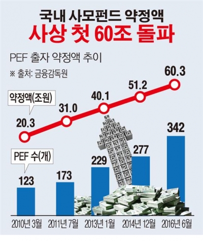 경영참여형 사모펀드(PEF) 출자 약정액이 처음으로 60조 원을 웃돌았다.