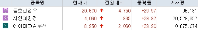 유가증권 시장에서는 금호산업우가 전일 대비 4750원(29.97%) 오른 2만600원에 거래를 마쳤다.