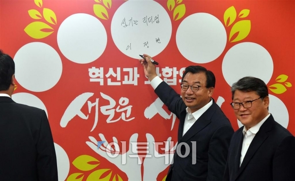이정현 새누리당 신임 대표가 10일 서울 여의도동 새누리당 당사에서 열린 최고위원회의에 참석해 다짐을 적고 있다. 신태현 기자 holjjak@