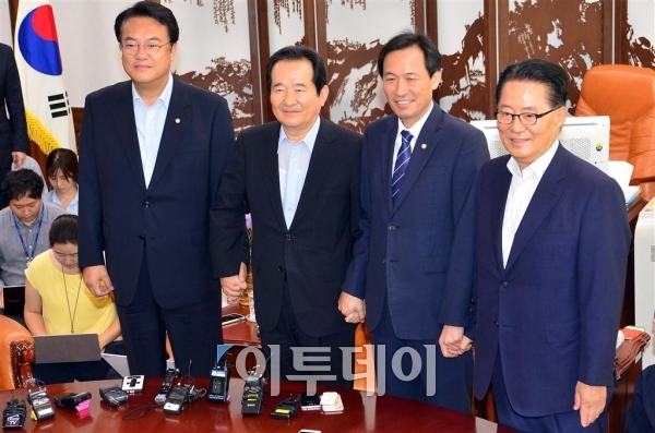 정진석 새누리당 원내대표, 정세균 국회의장, 우상호 더불어민주당 원내대표, 박지원 국민의당 원내대표(왼쪽부터)가 12일 서울 여의도동 국회에서 열린 국회의장 주재 여야 3당 원내대표 회동에 앞서 손을 맞잡고 있다. 신태현 기자 holjjak@
