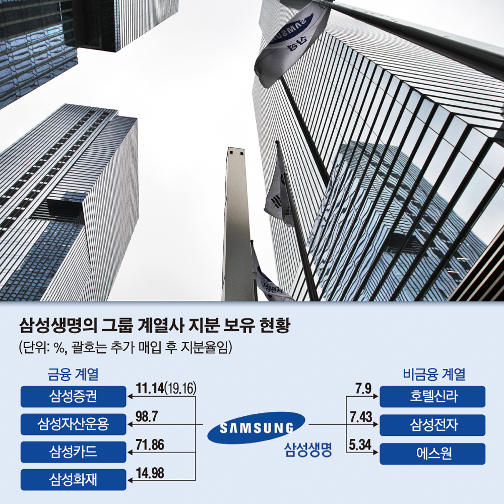 삼성생명의 금융지주회사 전환 걸림돌은 비금융계열사의 높은 지분 보유율과 중간금융지주회사법 발효 여부다.