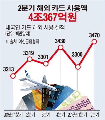 2분기(4~6월) 국내 거주자들의 카드 해외 사용 실적이 사상 최대치를 경신했다.