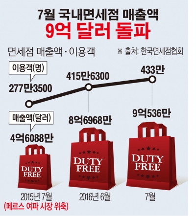 한국면세점협회는 7월 매출액이 내국인 2억6785만 달러(약 3008억 원), 외국인 6억3751만 달러(약 7159억 원)등 총 9억536만 달러(약 1조167억 원)를 기록했다고 23일 밝혔습니다.