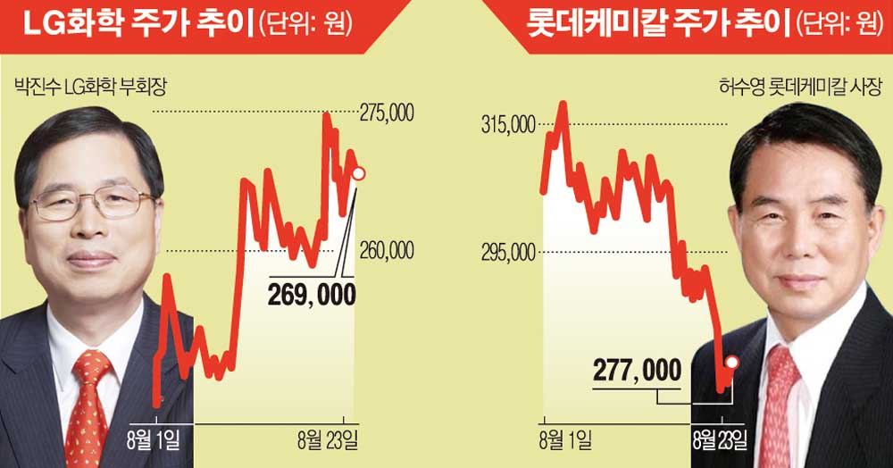 두 회사 모두 2분기에 최대 영업이익을 기록하는 깜짝 실적을 기록했다. 하지만 주가는 이달 들어 엇갈린 행보를 그리고 있다. LG화학은 꾸준히 상승세다. 지난달 말 24만3500원이었던 LG화학 주가는 현재(23일 종가기준) 27만원으로 10.47% 오른 상태다. 반면 롯데케미칼은 지난달 말 30만3500원에서 현재 27만7000원으로 이달 들어서만 8.73% 떨어졌다.