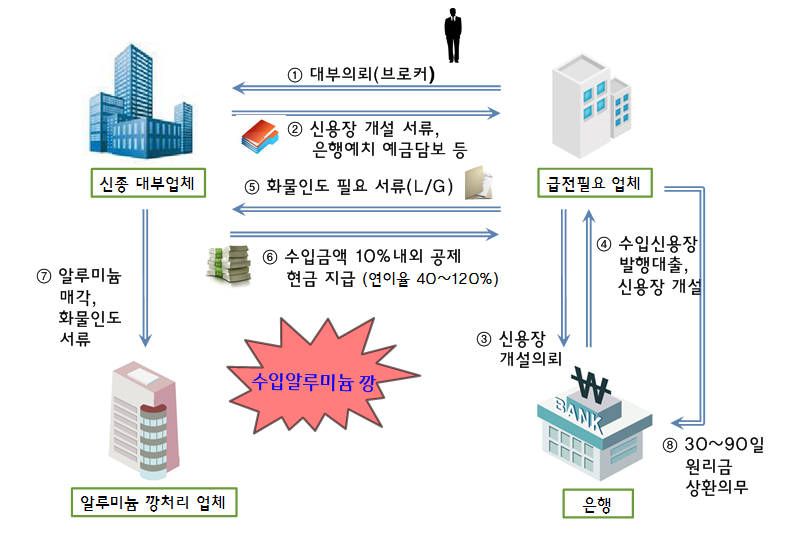 중소 무역업체를 운영하는 A 씨는 자금난을 겪자 속칭 '알루미늄 깡'을 통해 돈을 끌어오기로 했다. A 씨의 업체는 이미 여신한도를 채워 정상적인 대출이 어려웠지만, 원자재 수입을 이유로 신용장을 개설하면 이를 근거로 대출이 가능했다. 수출 활성화를 위해 은행이 먼저 대금을 지급해주는 '수입 신용장 발행 대출'을 악용한 것이다. 신용장 개설에 필요한 매도의향서와 예금담보 등은 전문 '깡처리 업체'가 대신했다. 결국 Y 씨는 알루미늄 수입업자로 가장해 수입액의 10%를 수수료로 지급하는 조건으로 자금을 융통했다.