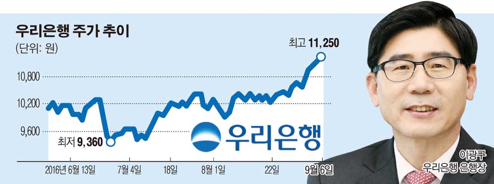 우리은행 주가는 지난달 24일 매각공고 이후 꾸준히 상승해 최근 52주 신고가 기록을 계속 갈아치우고 있다.