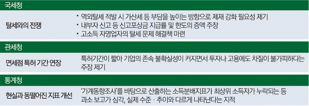 고소득 자영업자의 탈세 문제를 해결하는 것도 빼놓을 수 없는 과제로 꼽힌다. 국세청에 의하면 고소득 전문직 및 고소득 자영업자 등 고소득층의 소득적출률은 2005년 12월 56.9%에서 2009년 9월 31.2%까지 하락하다가 이후 지속적으로 증가해 2014년에는 43.1%까지 늘어났다.