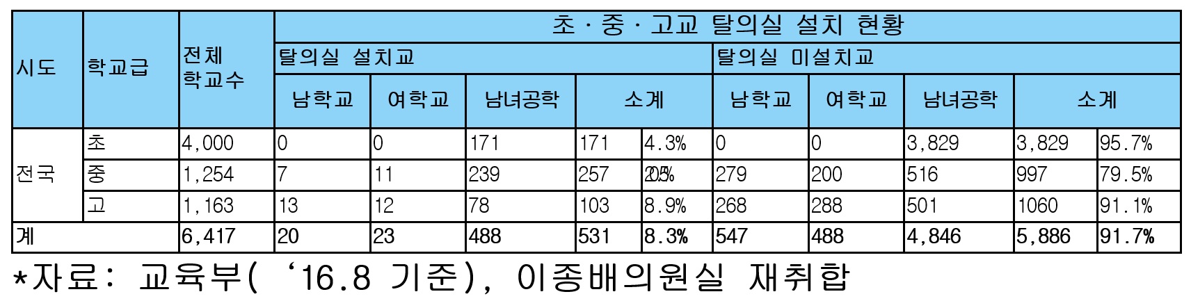 전국의 초‧중‧고등학교 10곳 중 9곳은 탈의실이 없어, 체육시간에 교실이나 화장실에서 옷을 갈아입고 있다는 지적이 나왔다.
