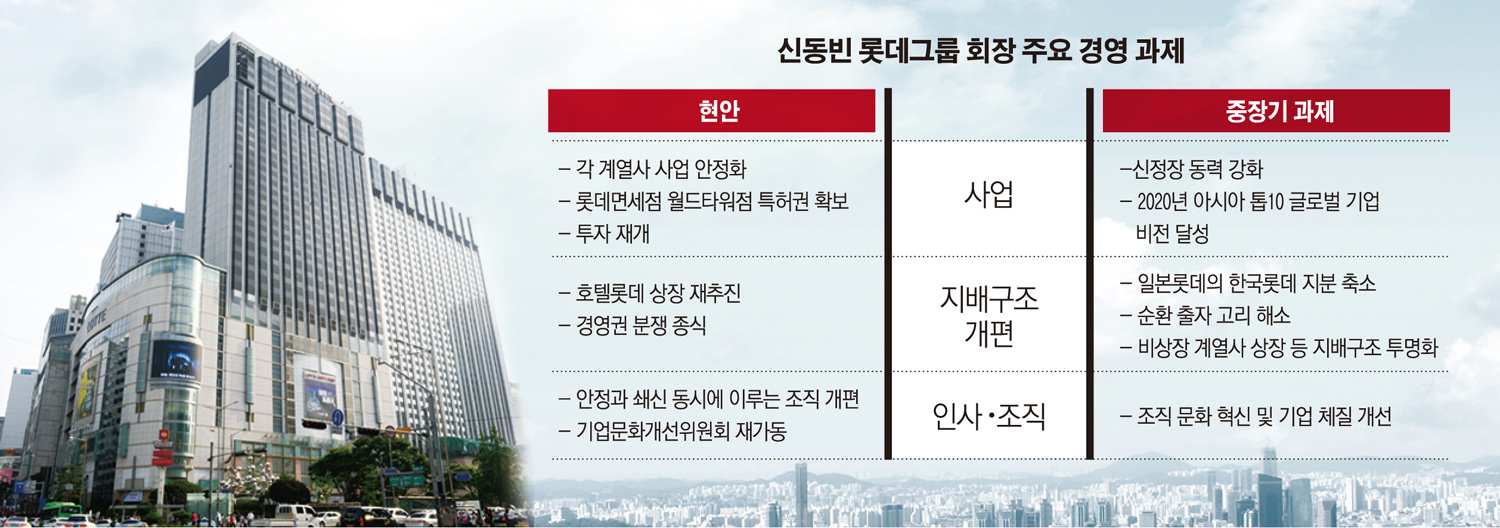 현재 호텔롯데의 최대주주는 신 회장이 대표이사로 등기된 12개 L투자회사들(지분율 72.65%)이고, 여기에 일본 롯데홀딩스의 지분(19.07%)까지 더하면 사실상 일본 롯데 계열사들이 호텔롯데 지분의 99% 가까이 장악하고 있다. 신 회장은 지난 7월 한·일 롯데 총수 자리에 오른 뒤 경영권 분쟁을 거치며 일본 기업 논란 불식 차원에서 호텔롯데 상장을 추진하고, 국내 대기업집단(재벌) 가운데 가장 복잡했던 계열사 간 순환출자 고리의 80%를 끊었다. 롯데그룹은 호텔롯데를 상장하면 일본 주주의 영향력이 90%대에서 50%대로 줄어 한국 롯데의 독립성과 자율권이 커질 것으로 보고 있다.