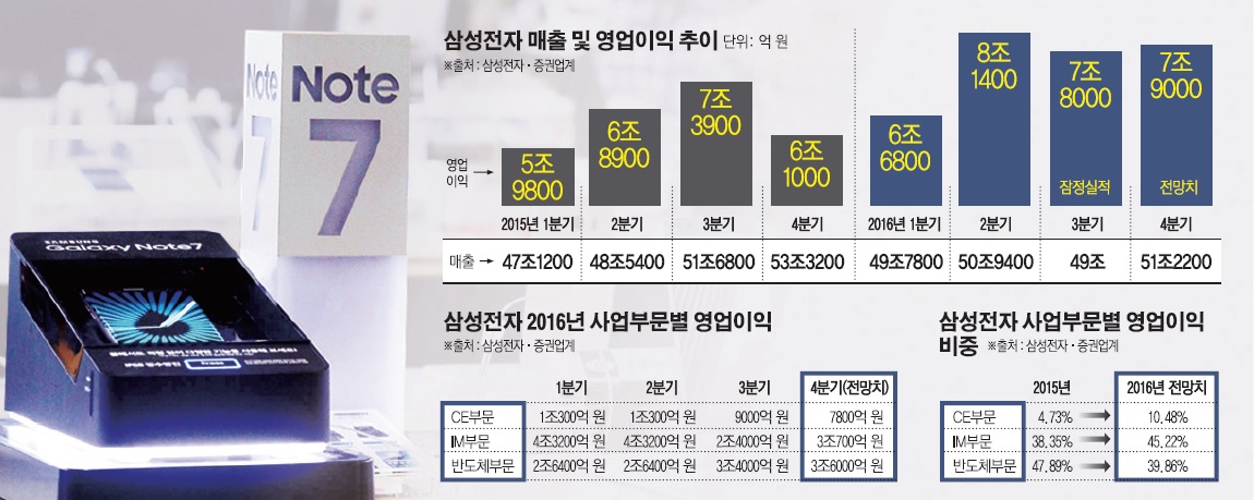 ‘갤럭시노트7’ 발화로 인한 글로벌 전량 리콜(제품 회수) 및 한 달여간의 판매 공백에도 불구하고, 삼성전자는 영업이익 7조 원대를 지켰다. 4분기 실적은 갤럭시노트7 안정화 여부에 달려 있다.