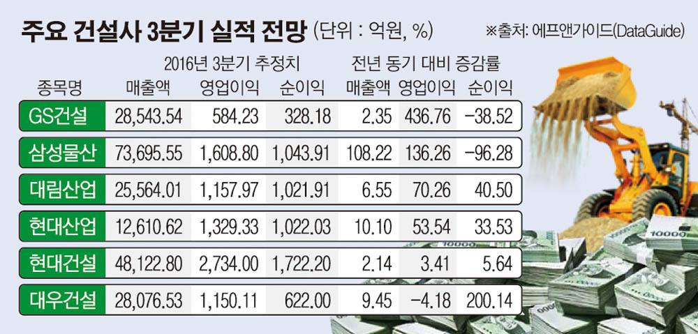 수년간 이어지던 해외사업장의 부실이 마무리되고 국내 주택시장의 호조세가 이어지면서 3분기 건설사들의 실적 개선세가 기대되고 있다.