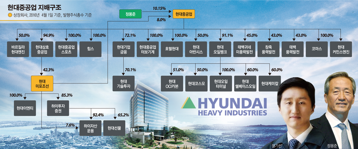 정 이사장이 낮은 지분으로도 그룹에 영향을 행사할 수 있는 것은 순환출자 구조 때문이다. 현대중공업그룹은 ‘현대중공업→현대삼호중공업→현대미포조선→현대중공업’으로 이어지는 순환출자 구조를 갖는다. 현대중공업이 현대삼호중공업의 지분 94.92%를 보유하고 있고, 현대삼호중공업은 현대미포조선 지분 42.34%를 갖고 있다. 또 현대미포조선은 다시 현대중공업 지분 7.96%를 보유 중이다. 공정거래법상 지금의 순환출자 구조가 강화되지 않으면 문제의 소지가 없지만 정치권, 특히 야권에서 기존 순환출자 고리를 금지하는 개정안을 발의하는 등 압박 수위를 높이면서 장기적으로는 순환출자를 해소해야 할 것으로 보인다.