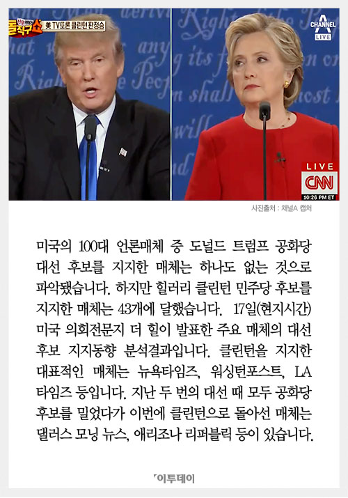 역대 공화당 후보 중 100대 매체로부터 ‘지지 0개’라는 성적표는 트럼프가 처음인데요. 이를 바탕으로 힐러리는 경합주를 넘어 전통적인 공화당 텃밭까지 공격적인 선거운동에 나설 예정입니다.