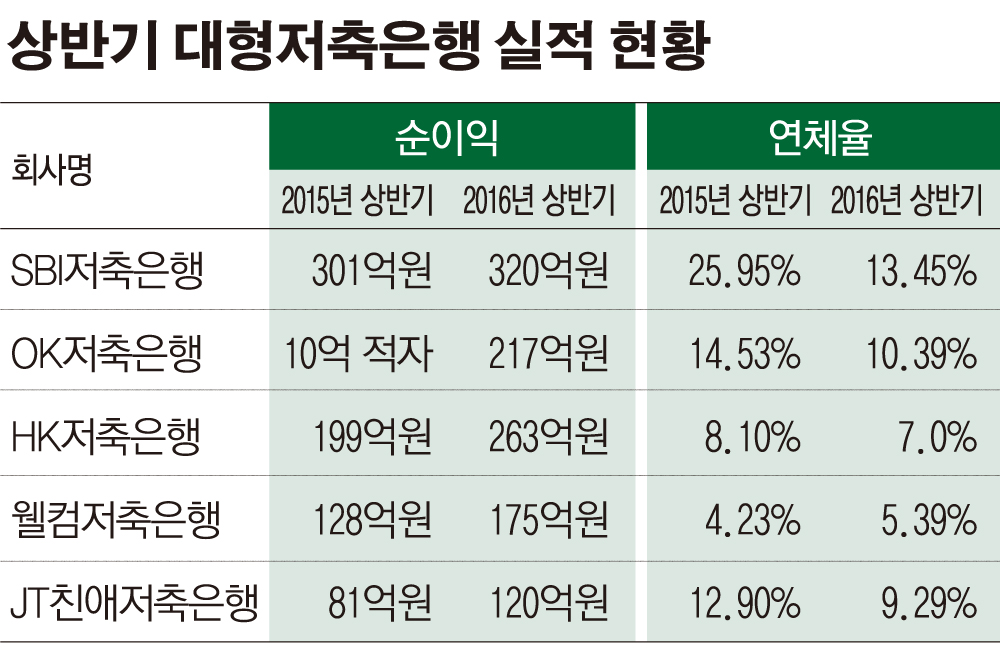 OK저축은행은 지난해 상반기 10억 원 적자를 기록했지만, 올해 상반기 217억 원 순이익을 거뒀다. HK저축은행은 지난해 상반기보다 64억 원, 웰컴저축은행은 47억 원, JT친애저축은행은 39억 원 순이익이 증가했다.