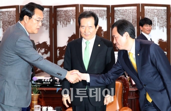 정세균 국회의장(가운데) 주선으로 31일 서울 여의도 국회 의장실에서 여야 원내대표 회동이 열린 가운데 정진석 새누리당 원내대표(왼쪽)와 우상호 더불어민주당 원내대표가 악수를 하고 있다. 고이란 기자 photoeran@