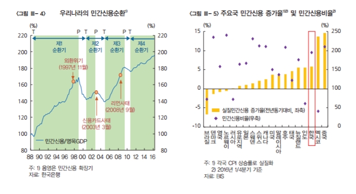 보고서에 따르면 명목GDP 대비 민간신용 비율을 기준으로 우리나라 민간신용의 순환국면을 살펴본 결과 1988년 이후 세 차례의 순환기를 거쳐 현재 제4순환기의 확장국면(2010년 4분기~)에 해당한다고 설명했다.