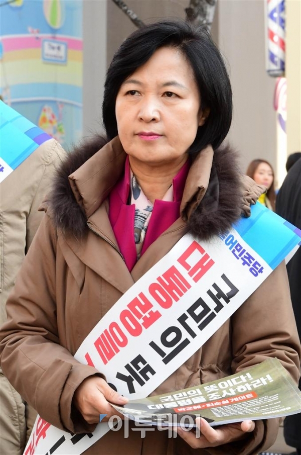 추미애 더불어민주당 대표가 2일 서울 여의도역 인근에서 박근혜 대통령 비선 실세로 지목된 최순실 씨의 국정 개입 진상규명 홍보 캠페인을 열고 지나가는 시민들에게 유인물을 나눠주고 있다. 고이란 기자 photoeran@