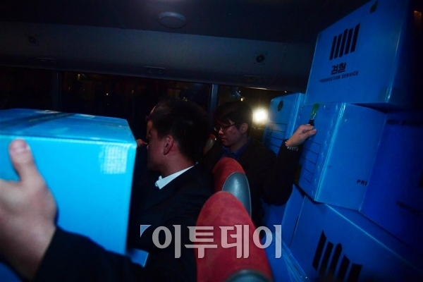 검찰 특별수사본부가 8일 서울 삼성전자 서초사옥에서 비선실세 최순실 씨의 딸 정유라 씨에 대한 삼성의 특혜 지원 의혹과 관련해 압수수색 마치고 관련 자료를 상자에 담아 이동하고 있다. 고이란 기자 photoeran@