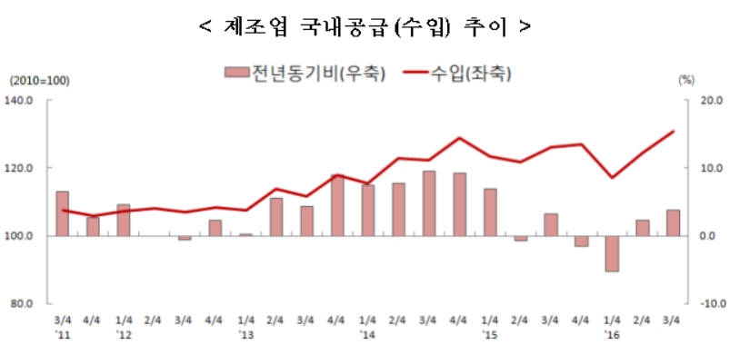 어윤선 통계청 산업동향과장은 “국내 제조업 공급비중에서 국내 공급량이 정체를 보인 반면 수입공급량이 늘면서 통계를 작성한 2010년 1분기 이후 수입이 차지하는 비중이 제일 높게 나왔다"고 설명했다.
