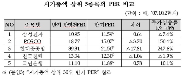 한편 한국시장의 대표우량주의 반기 PER를 산출한 결과 순이익이 증가한 경우 PER가 낮아지고, 순이익이 감소한 경우 PER가 높아진 것으로 나타났으나 주가상승률은 개별기업에 따라 다른 양태를 보였다.