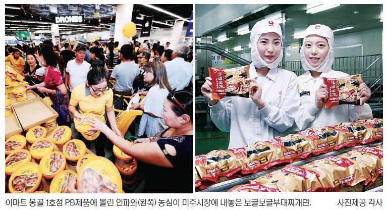 이마트가 수출하는 상품은 올해 기준 약 1만2000가지다. 수출 국가도 홍콩을 시작으로 현재 중국, 베트남, 몽골 등 10개 국으로 늘어났다. 실제 노브랜드와 피코크 등 이마트가 국내 우수 중소기업과 함께 개발한 PL상품은 해외에서 큰 인기를 누리며 올해 100억 원까지 수출 규모를 키웠다. 회사 측은 내년 수출 목표를 올해보다 210억 원 늘어난 약 530억 원으로 잡았다. 수출 국가도 20개까지 늘린다는 계획이다.