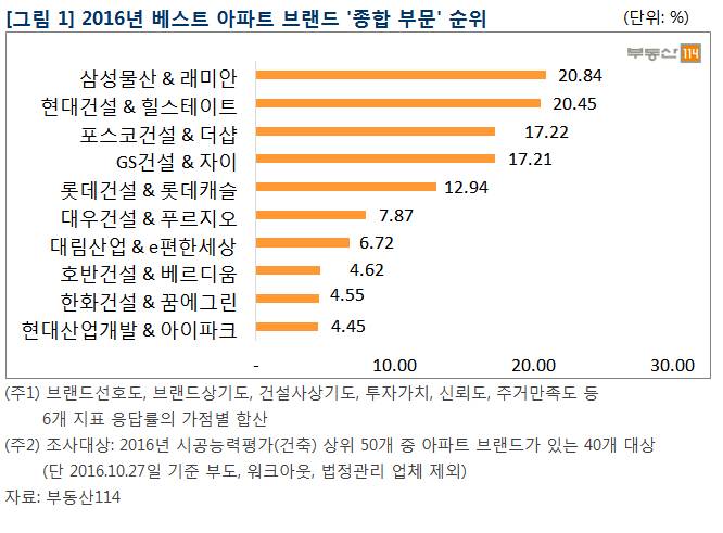 부동산114는 지난 10월31일부터 11월18일까지 전국 성인남녀 1509명을 대상으로 아파트 브랜드 40개에 대해 ‘2016년 베스트 아파트 브랜드’ 설문조사를 진행했다. 베스트 아파트 브랜드 종합대상 선정방식은 브랜드선호도 및 상기도, 건설사상기도, 투자가치, 신뢰도, 주거 만족도 등 6개 부분의 응답률에 가점을 적용해 합산한 것이다.