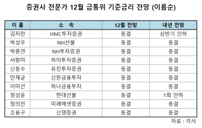 내년 금리에 대해서도 동결 전망이 우세했다. 내년 역시 미국 금리 인상 가능성이 높은 데다, 유가 회복에 물가가 오름세를 보인다는 점이 금리 운신의 폭을 제약할 것으로 내다봤다.