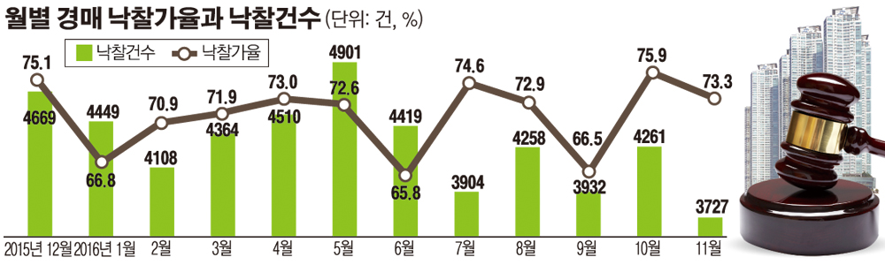 평균 낙찰가율도 하락했다. 11월 전국 법원경매 평균낙찰가율은 73.3%로 전월대비 △2.5%p 하락했다. 2011년 이후 지난 5년간 전국 평균 낙찰가율인 69.5%와 비교해보면 11월 낙찰가율이 높은 수준을 유지하고 있지만 최근 1년 사이 특정물건의 영향 없는 평균낙찰가율 하락은 처음이다.