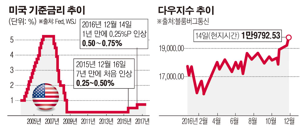미국 연방준비제도(Fed·연준)가 1년 만에 기준금리를 인상했다. 최근 고용시장 개선과 물가상승 전망, 도널드 트럼프 대통령 당선인의 경기 부양책에 대한 기대감 등이 두루 반영된 예상된 결과다. 그러나 연준 위원들이 내년 금리인상 횟수를 기존보다 늘려 잡으면서 긴축 속도가 예상보다 빨라질 것이라는 우려에 뉴욕시장은 크게 요동쳤다.