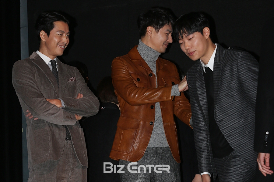 배우 정우성,조인성,류준열이 15일 오전 서울 강남구 신사동 CGV 압구정에서 진행된 영화 '더 킹' 제작발표회에서 포토타임을 기다리고 있다.