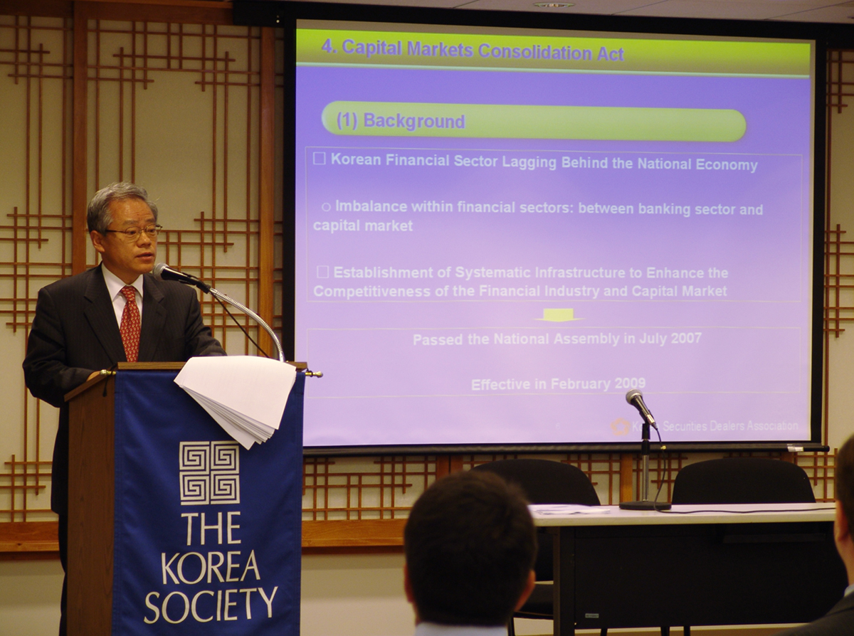 황건호 한국증권업협회 회장이 지난 19일(현지시간) 미국 뉴욕 소재 코리아 소사이어티(Korea Society)가 주최한 정책포럼에 참석해 ‘전환기의 한국 자본시장’에 대한 주제발표를 하고 있다.