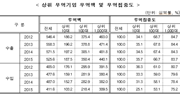 지난해 기준 수출 상위 10대 기업은 전체 수출액의 35.7%를, 상위 100대 기업은 66.7%를, 상위 1000대 기업은 83.7%까지 치솟았다.