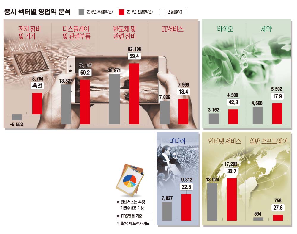 에스엠과 와이지엔터는 중국 규제 이슈에 따른 주가 하락에도 2016년 3분기(7~9월) 연결기준 매출액 1000억 원을 돌파하는 등 실적 상승세를 이어갔다. 이남준 KTB투자증권 연구원은 “4분기 일본 매출 인식 콘서트 관객 수가 40만 명으로 나타났다”며 양호한 실적 흐름을 예상했다. 금융정보업체 에프앤가이드는 올해 엔터테인먼트 전체 업종의 영업이익을 9312억 원으로 추정했다. 이는 지난해 7027억 원 대비 32.5% 증가한 수치다.