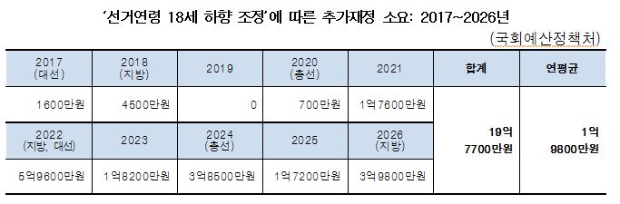 예산처는 법 개정이 이뤄질 경우 선거권자 증가에 따른 선거관리 비용, 정당보조금 증가 등을 추가비용 발생 요인으로 꼽았다. 다만 국가에서 정당에 지급하는 보조금은 국회의원선거의 선거권자 총수 등에 따라 달라져, 21대 국회가 들어서기 전인 2021년까지는 변하지 않는다.