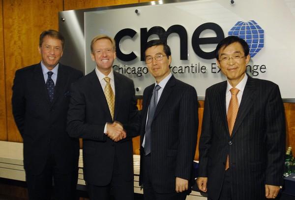 왼쪽부터 Mr.Terrence Duffy(테렌스 더피) CME Chairman, Mr.Craig Donohue(크렉 도너휴) CME CEO, 권오규 부총리 겸 재정경제부 장관, 이영탁 한국증권선물거래소 이사장.