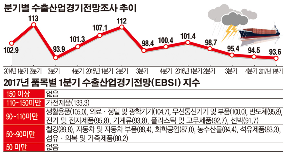 한국무역협회 국제무역연구원은 수출실적 50만 달러 이상인 2000개(응답률 27.8%) 기업을 대상으로 지난달 20∼27일 수출산업경기전망조사(EBSI)를 진행한 결과 EBSI 지수는 93.6으로 지난해 4분기의 94.5보다 떨어졌다고 9일 밝혔다.