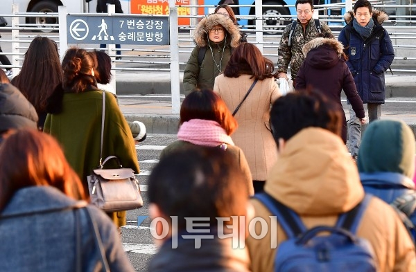 전국에 한파특보가 내린 10일 오전 서울역 버스환승센터를 건너는 시민들이 두터운 외투를 입고 갈길을 재촉하고 있다. 이동근 기자 foto@